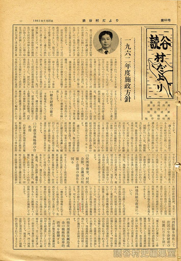 本年度は、いうなれば二年生になったのでありますから過去を反省し更に研鑽を重ねて自己流を改め建設的な批判と世論に基いて村民の欲求にかなったよりよい行政を合理的に遂行、住民福祉の向上に一段と努力する所存であります。