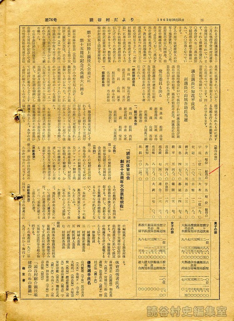 才入の面では財産収入の村有地賃貸料二、○八三弗、政府支出金が八四四弗、前年度の繰越金が五、七九五弗で、合計八、七二二弗が才出の財源に充当されています。次に読谷村税条例の一部改正は去った六月二十三日に交付なりました「市町村税法の一部を改正する立法」に基き改正されたものでこれは村税の諸控除額の引上げを行うため改正されたのであります。教育税条例の改正は従来本村の教育税が村民税と固定資産税を基準に賦課されていたがこれに新に事業税を加えるように改正なっています。固定資産税の免除については法で定められたものに対する免税を行うため提案されたのであります。