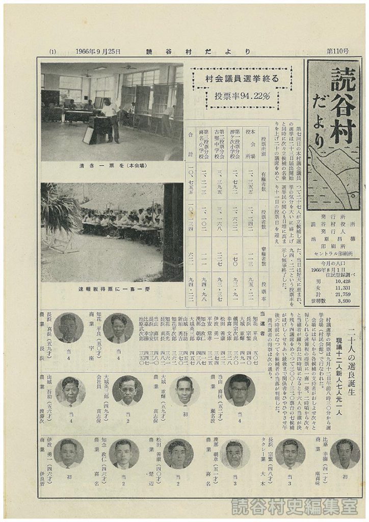 第七回目の本村議会議員の選挙は二十三日届出開始と同時に次々立候補の名乗りを上げ二十の議席をめぐつて二十七人が立候補し選挙の気分を大いに盛上げ選挙民の関心も日増に高まり十一日の投票日を迎えた、当日は好天に恵まれ、九四・二二という投票率を示し無事終了した。