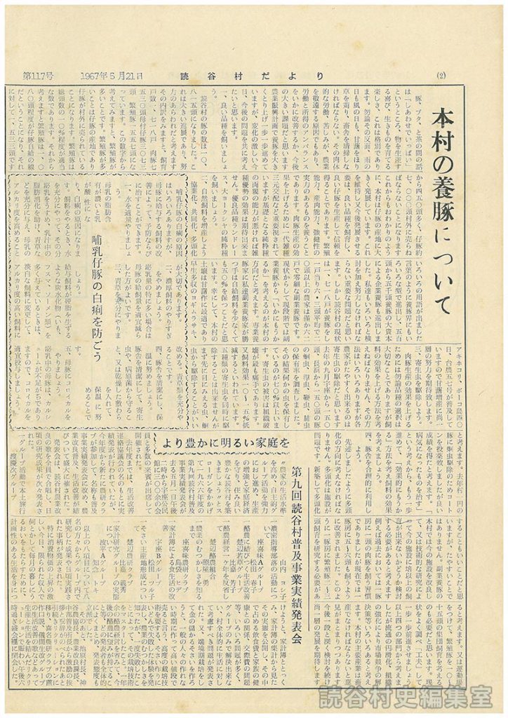 先述しましたように多頭化の方向に考えなければなりません。多頭化は施設が問題です。新築して多頭化することもいいことだと思いますが、たやすいことではありません。副業養豚の本村では今の施設を改良して、又は技術的な研究によって今の施設に培以上の飼育が出来ないかどうか検討する必要があると考えます例えば過去においては一豚房に一頭の肉豚を飼う習慣でありましたが現在では一豚房に五~六頭も飼うように改善されました。このように一豚房に繁殖豚二~三頭飼育を研究する必要があると考えます。又は運動場をつけて、繁殖豚を一〇~十五頭の集団飼育を考えるのも必要だと思います。現状をよく調べ「工夫」して一歩一歩前進させましょう以上四つの部門から考えましたが流通の円滑化、組織の強化により市場競争の解決策等いろいろあると考えます。本村の主要産業は畜産でなければならないと意見がまとまりつつあります今後一段と深く検討を続け尚一層の発展を期待します