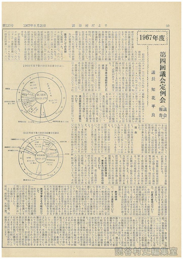 村民の皆様に一九六八年度の予算を審議した本村第四回議会定例会の経過と結果を次のように御報告致します。去る六月十一日から六月三十日までの二十日間の会期をもちまして村長から提出された議案が三十六件陳情一件計三十七件の議案を慎重に審議しました結果幾分か修正又は否決された議案もありますが、全議案審議終了し第四回議会定例会を無事閉会しましたが特に、六八年度予算を成立させるに当り本会として、村長並びに関係当局に要請しました事項を申し添えて御報告致します。