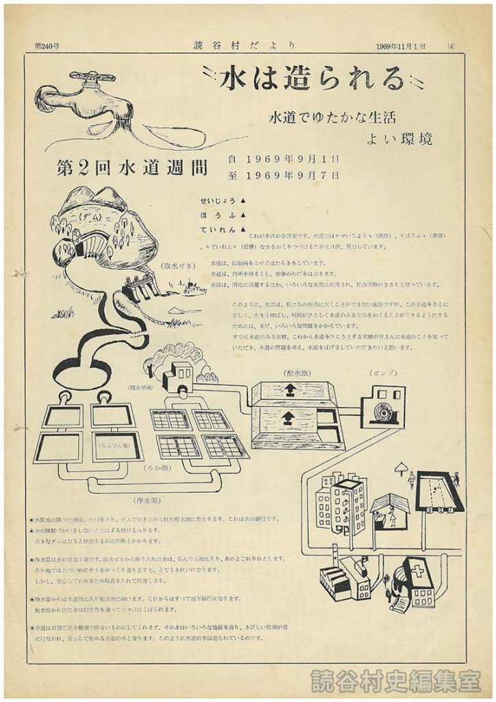 このとうに、水道は、私たちの生活に欠くことができない施設ですが、この水道をさらに正しく大きく伸ばし、村民がひとしく水道のある生活をおくることができるようにするためには、まだ、いろいろな問題をかかえています。