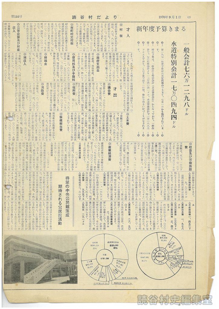 村の予算は、一般会計と特別会計(水道事業会計)からなっており、一般会計で、七〇年度会計より一三万四〇四一ドル、水道事業会計で一万一八八三 ドルふえており、この予算で向う一年間、豊かで明るい村づくりがなされます。