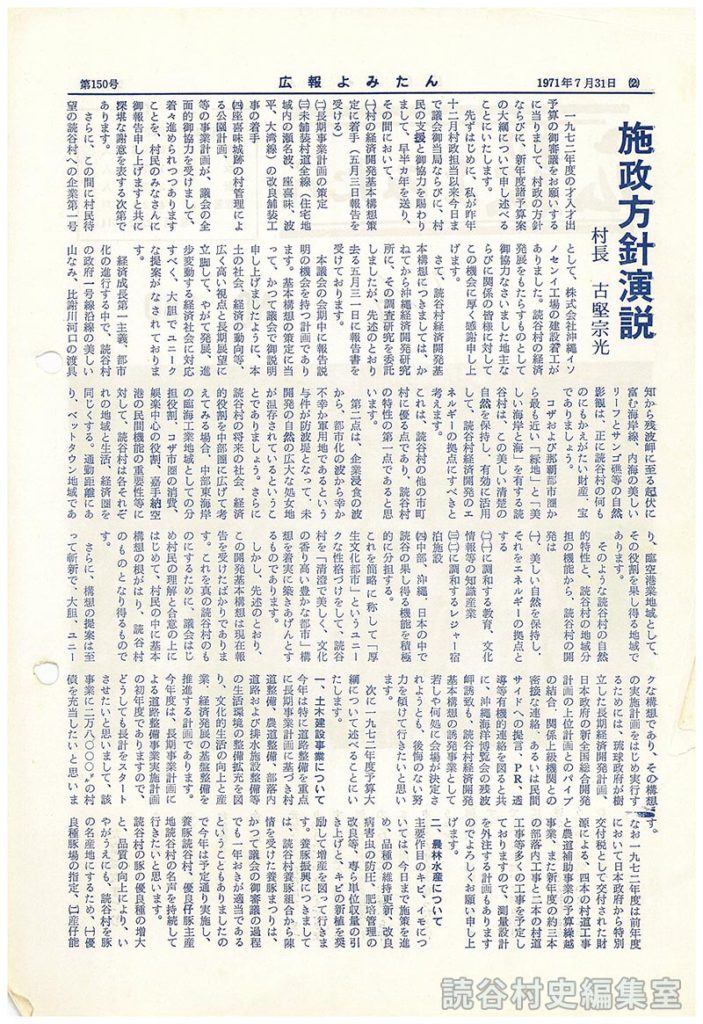 さらに、構想の提案は至って斬新で、大胆、ユニークな構想であり、その構想の実施計画をはじめ実行するためには、琉球政府が樹立した長期経済開発計画、日本政府の新全国総合開発計画の上位計画とのパイプの結合、関係上級機関との密接な連絡、あるいは民間サイドへの提言、PR、透導等有機的連絡を図ると共に、沖縄海洋博覧会の残波岬誘致も、読谷村経済開発基本構想の誘発事業として若しや何処に会場が決定されようとも、後悔のない努力を傾けて行きたいと思います。