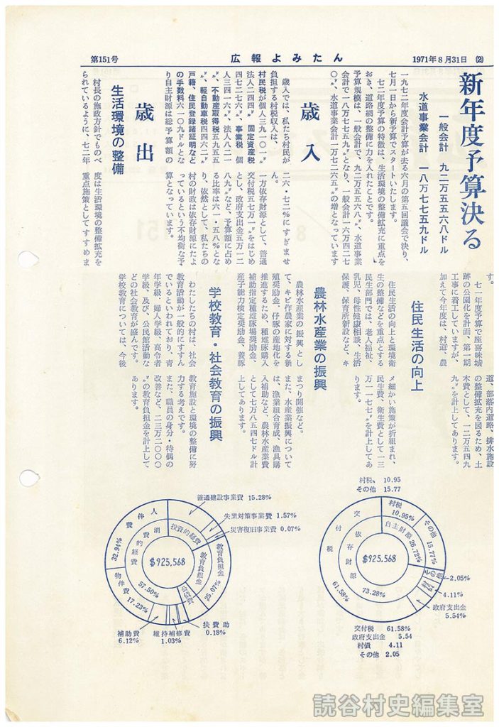 住民生活の向上と環境衛生の整備などを重点とする民生部門では、老人福祉、乳児、母性健康相談、生活保護、保育所新設など、キメ細かい施策が折組まれ、民生費、衛生費として、一三万一一七七ドルを計上してあります。