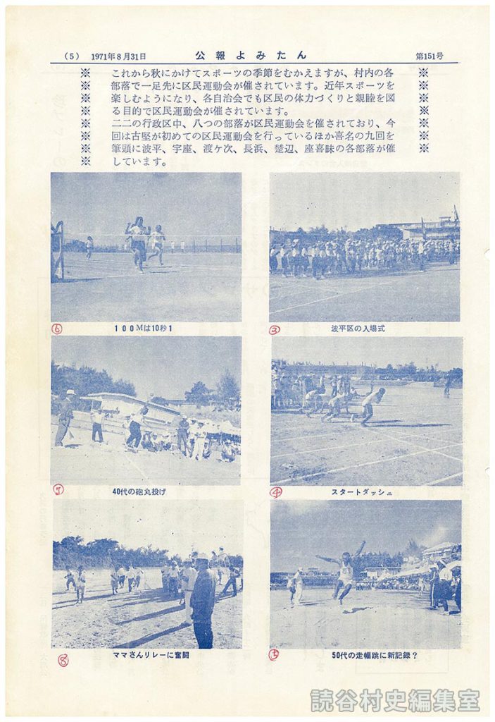 二二の行政区中、八つの部落が区民運動会を催されており、今回は古堅が初めての区民運動会を行っているほか喜名の九回を筆頭に波平、宇座、渡慶次、長浜、楚辺、座喜味の各部落が催しています。