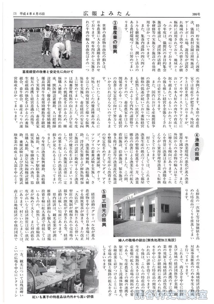 一方、観光については残波岬いこいの広場を中心にレクリェーション施設等の整備、史跡等名所の整備を行い拠点づくりを実施するとともに、残波まつり、伝統工芸の振興、特産品の開発生産と併せて観光産業の体制づくりに努めてまいりました。本村にはリゾート施設として沖縄残波岬ロイヤルホテルがあり、さらには、地元主体によるゴルフ場もオープンし、またもう一方のリゾート計画も進行中であります。今年度は、NHKエンタープライズ制作の大河ドラマ「琉球の風」のロケーションも読谷の地で計画されており、観光産業をはじめ地域づくりの活性化に役立つものと期待するものであります。今後はリゾート施設、レクリェーション施設、名所旧跡、伝統工芸及び特産品等を有機的に結びつけ、観光産業の育成と併せて農業、製造業及び商業への波及効果を高めてまいります。