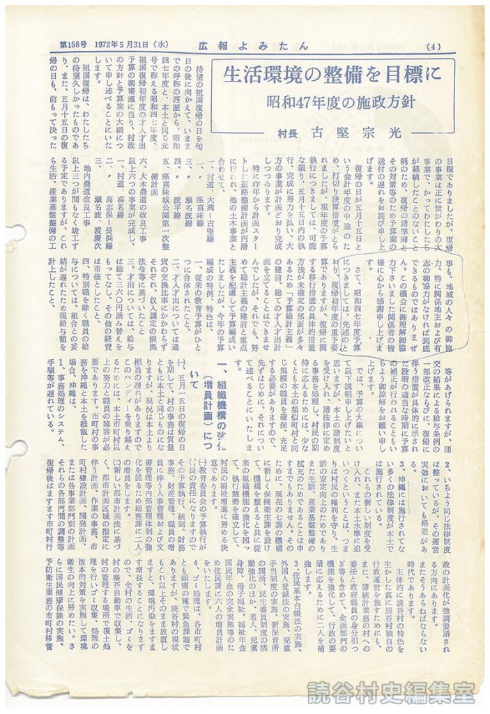 これらの新しい制度を受け入れ、また、本土水準に追いつくということは、つまりは村民の権利を守り、生活の安定向上のためでありまた生活、産業基盤整備の拡充のためであることは申すまでもありません。そのために、現在の七課の機構に新しく保健衛生課を設けて、機構を整えると共に従来の組織機能の強化を図って、執行体制を確立して、村民の福祉増進に努める決意であります。