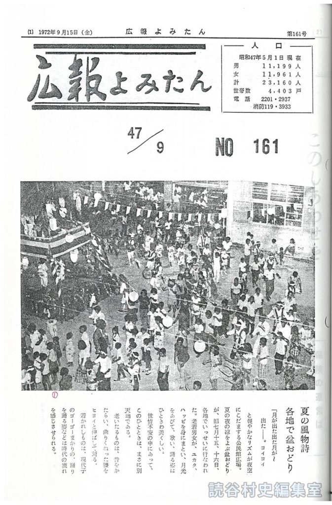 1972年9月発行 広報よみたん / 1頁 人口 この号の全件を見る 広報よみたん 47/9 NO161 人口 昭和47年5月1日現在 男 11,199人 女 11,961人 計 23,160人 世帯数 4,403戸 電話 2201・2937 消防 119・3933