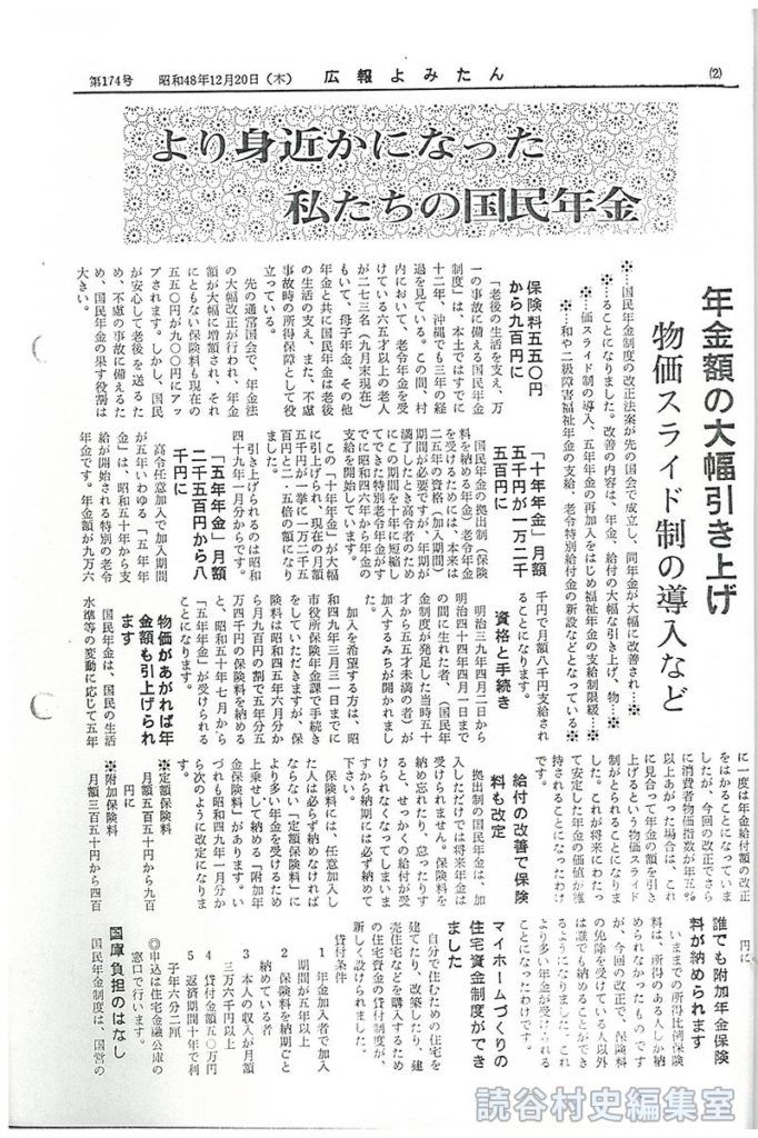 「老後の生活を支え、万一の事故に備える国民年金制度」は、本土ではすでに十二年、沖縄でも三年の経過を見ている。この間、村内において、老齢年金を受けている六十五才以上の老人が二七三名(九月末現在)もいて、母子年金、その他の年金と共に国民年金は老後の支え、また、不慮の事故時の所得保障として役立っている。