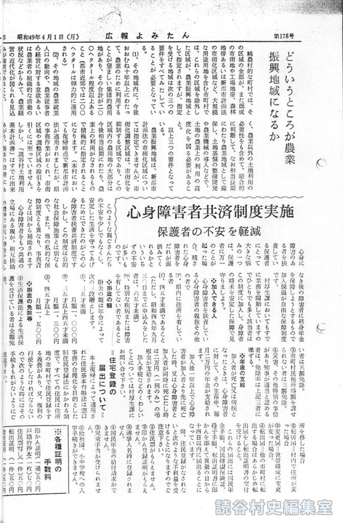 農業振興地域は、新都市計画法の市街化区域については指定できませんが、市街化調整区域は、市街化を抑制する区域であり、この区域内の農用地の大部分は今後相当長期にわたり、農業上の利用がなされるもので積極的に指定されることになります。(本村においても復帰時点で新都市計画法が適用されましたが、県の事務作業がおくれ、市街区域や調整区域の線引きを引くには至っていません。しかし、「読谷村土地利用基本計画書」はすでに出来あがり、製本の段階にあります。)