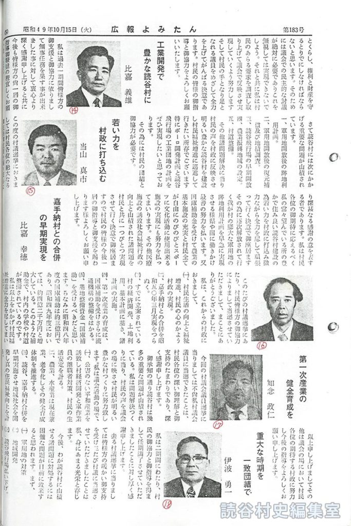 わたしの抱負 工業開発で豊かな読谷村に 比嘉義雄 若い力を村政に打ち込む 当山真市 嘉手納村との合併の早期実現を 比嘉幸徳 第一次産業の健全育成を 知念政仁 重大な時期を一致団結で 伊波勇一