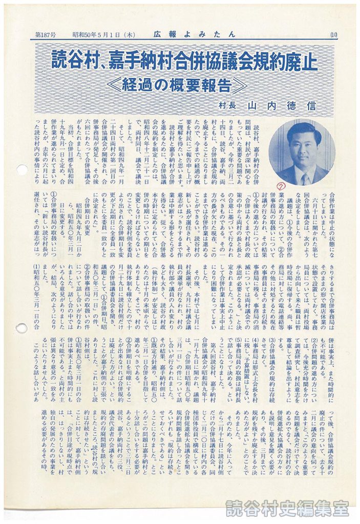 読谷村、嘉手納村の合併問題は、村民が深い関心を持っていた重要な問題でありましたが、今年の三月二十四日、読谷、嘉手納、両村ともに、合併協議会規約を廃止することになりましたので、今までの経過の概要を村民に御報告申し上げご理解を得たいと思います。
