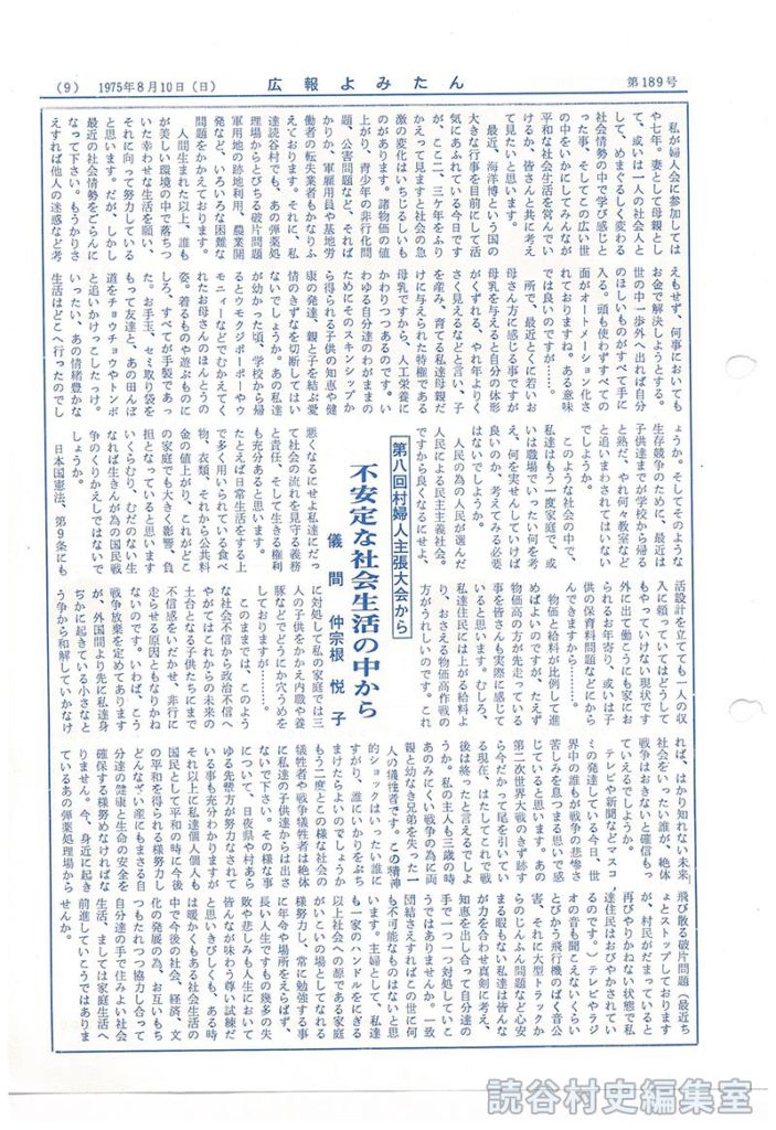 テレビや新聞などマスコミの発達している今日、世界中の誰もが戦争の悲惨さ苦しみを息つまる思いで感じていると思います。あの第二次世界大戦のきず跡すら今だかって尾を引いている現在、はたしてこれで戦争は終ったと言えるでしょうか。私の主人も三歳の時あのみにくい戦争の為に両親と幼なき兄弟を失った一人の犠牲者です。この精神的ショックはいったい誰にすがり、誰にいかりをぶちまけたらよいのでしょうかもう二度とこの様な社会の犠牲者や戦争犠牲者は絶対に私達の子供達からは出さないで下さい。その様な事について、日夜件や村あらゆる先輩方が努力なされている事も充分わかりますがそれ以上に私達個人個人も国民として平和の時に今後の平和を得られる様努力しどんなざい産にもまさる自分達の健康と生命の安全を確保する様努めなければなりません。今、身近に起きているあの爆薬処理場から飛び散る破片問題(最近ちょっとストップしておりますが、村民がだまっていると再びやりかねない状態で私達住民はおびやかされているのです。)テレビやラジオの音も聞こえないくらいとびかう飛行機のばく音公害、それに大型トラックからのじんふん問題など心安まる暇もない私達は皆んなが力をあわせ真剣に考え、知恵を出し合って自分達の手で一つ一つ対処していこうではありませんか。一致団結さえすればこの世に何も不可能なものはないと思います。主婦として、私達も一家のハンドルをにぎる以上社会への源である家庭がいこいの場としてなれる様努力し、常に勉強する事に年令や場所をえらばず、長い人生ですもの幾多の失敗や悲しみも人生において皆んなが味わう尊い試練だと思いいびしくも、ある時は暖かくもある社会生活の中で今後の社会、経済、文化の発展の為、お互いもちつもたれつつ協力し合って自分たちの手で住みよい社会生活、ましては家庭生活へ前進していこうではありませんか。