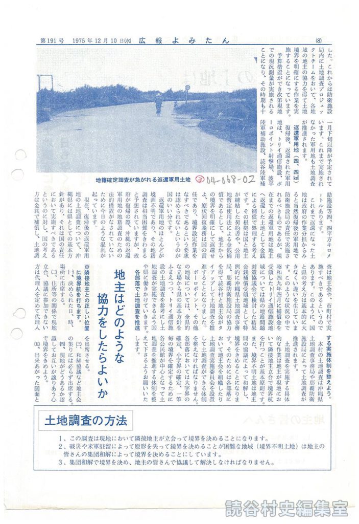 現在、復帰後の返還軍用地の土地調査について、沖縄県には県としての基本方針があり、それは国の責任において実施すべきであるというのに対し、国の考え方は金銭で補償し、土地調査は地主会や、市町村で実施すべきあるというのであります。このように、国と県の考え方は基本的に大きなくい違いを生じています。このような状況の中で昭和四九年四月に補償金を受領したトリイ通信施設については県の地籍問題対策協議会で検討した結果金銭補償受領地域として特例的に沖縄県土地調査事務局、那覇防衛施設局の協力を得て読谷村と地主会がタイアップして土地調査を推進することになりました。