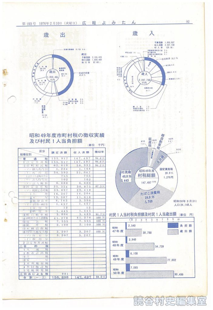 ※円グラフ「歳入」「歳出」、「昭和49年度 村税総額 147.497千円」、棒グラフ「村民1人当村税負担額及村民1人当歳出額 単位 円」、表「昭和49年度市町村税の徴収実績及び村民1人当負担額 単位 千円」 は原本参照