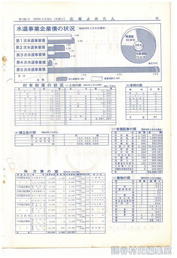 読谷村の財政 水道事業企業債の状況(昭和50年3月31日現在) 村有財産の状況 (イ)土地の部(昭和50年3月31日現在)単位:平方米 (ロ)車両の部 (ハ)有価証券の部(昭和50年3月31日現在) (ニ)建物の部(昭和50年3月31日現在) (ホ)積立金の部(昭和50年3月31日現在) 地方債の部(昭和50年3月31日現在