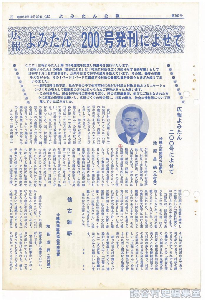 我が村の広報よみたん、それは正に村民の友であり村の歩みであり、村政の鏡であります。それで私はこの機会に、この「読谷村便り」を創刊された先輩の伊波村長と知花成昇助役の御両人とこれを継続発展させて村政の歩みを綴り、村民のありのままの姿を集録して名実共に充実したすばらしい「広報よみたん」を発行しつづけた村御当局の皆さんに対し深甚なる敬意を表わします。