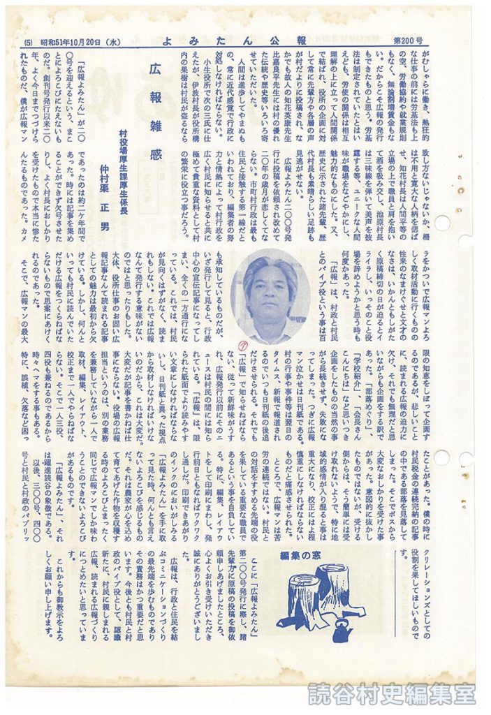 広報よみたん二〇〇号発行に投稿を依頼され改めて二〇年の歳月が恋しくてならない。市町村行政は最も住民と接触する第一線だといわれており、編集者の努力と情熱によって村行政を広く村民に知らせると共に極めて貴重な資料として村の繁栄に役立つ事だろう。