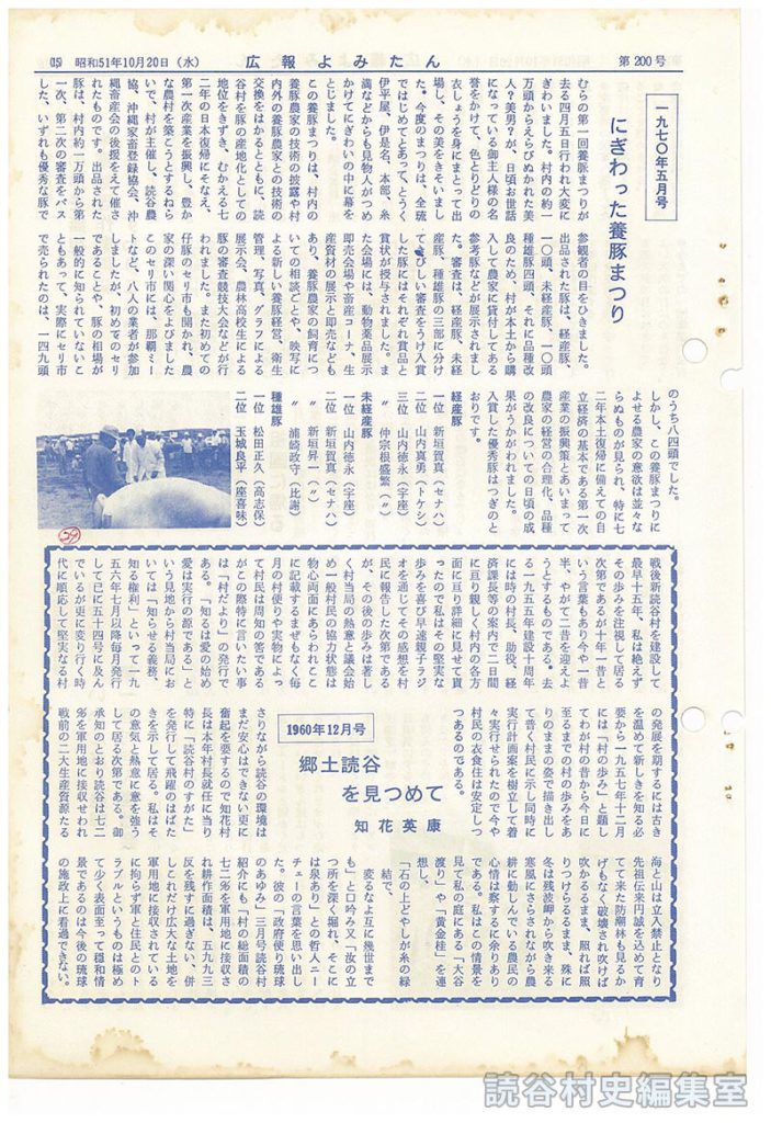 この養豚まつりは、村内の養豚農家の技術の披露や村内外の養豚農家との技術の交換をはかるとともに、読谷村を豚の産地化としての地位をきずき、むかえる七二年の日本復帰にそなえ、第一次産業を振興し、豊かな農村を築こうとするねらいで、村が主催し、読谷農協、沖縄家畜登録協会、沖縄畜産会の後援をえて催されたものです。出品された豚は、村内約一万頭から第一次、第二次の審査をパスした、いずれも優秀な豚で参観者の目をひきました。出品された豚は、経産豚、一〇頭、未経産豚、一〇頭種雄豚四頭、それに品種改良のため、村が本土から購入して農家に貸付してある参考豚などが展示されまし