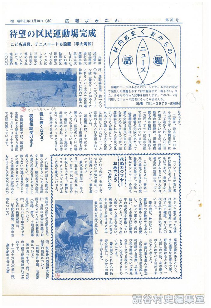 運動場の完成にあたって比嘉蕃信区長は「区民運動場の完成は区民の血のにじむ努力のたまものです。同運動場はこれから区民の体力づくりの場として、こどもあそび場として広く区民に利用していただく」。と完成のよろこびを語られていました。
