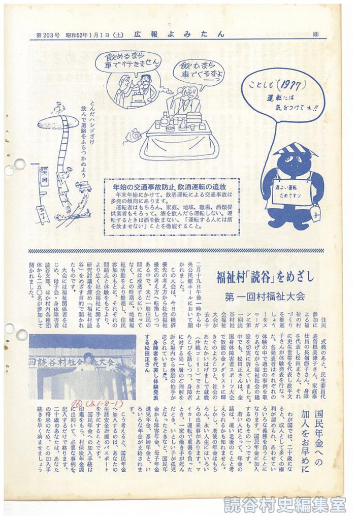 国民年金への加入手続は印鑑をもち、村保険年金課に出向いて、必要な事柄を記入するだけで終ります。二十歳のあなたは、あなたの将来のため、この加入手続きを早く済ませましょう