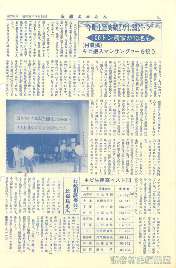 次に個人搬入高のベスト3は第一位に知念寺徳氏(高志保)二位に喜瀬普美夫氏(大木)三位に山内正俊氏(宇座) でした。一~ニ位の差はわずか四キロ、さとうきび五本差とあつてマンサン小の席上話題となつていた。一位の知念氏、ニ位の喜瀬氏は今期からはじめて生産する新設キピ作農家で、とくに喜瀬氏は二〇代のヤングフアーマーとして期待されている。又、三位の山内氏は去年の一位の座を明け渡したが述続一〇〇トンの実績をあげ篤農家健在ぶりを発輝した。