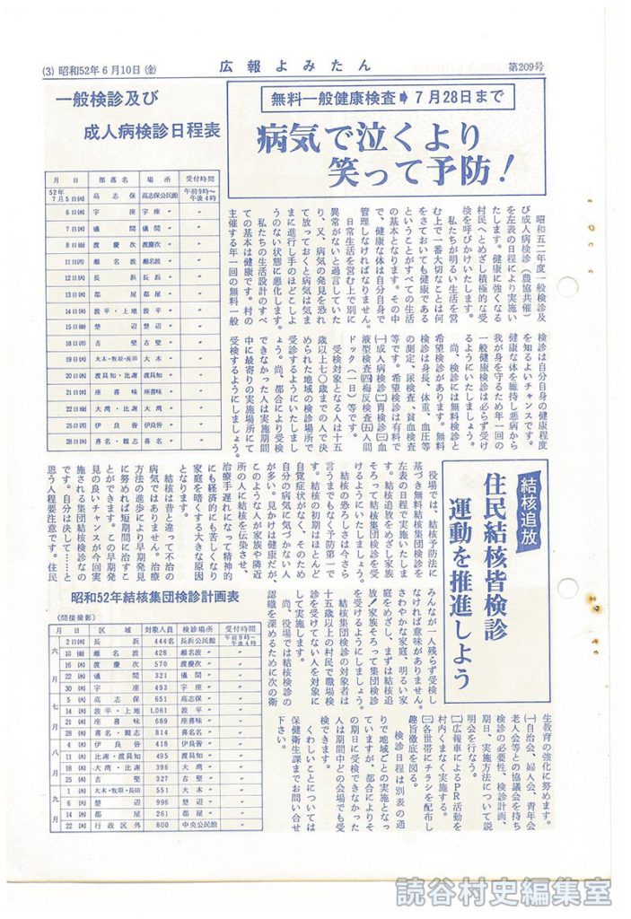 昭和五二年度一般検診及び成人病検診(農協共催)を左表の日程により実施いたします。健康に強くなる村民へとめざし積極的な受検を呼びかけいたします。