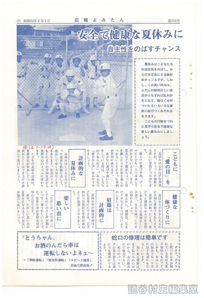 1977年8月発行 広報よみたん / 7頁 “とうちゃん”お酒のんだら車は運転しなよネェ~ この号の全件を見る “とうちゃん”お酒のんだら車は運転しなよネェ~ ・「酒酔運転」「無免許運転」「スピード違反」交通三悪追放!