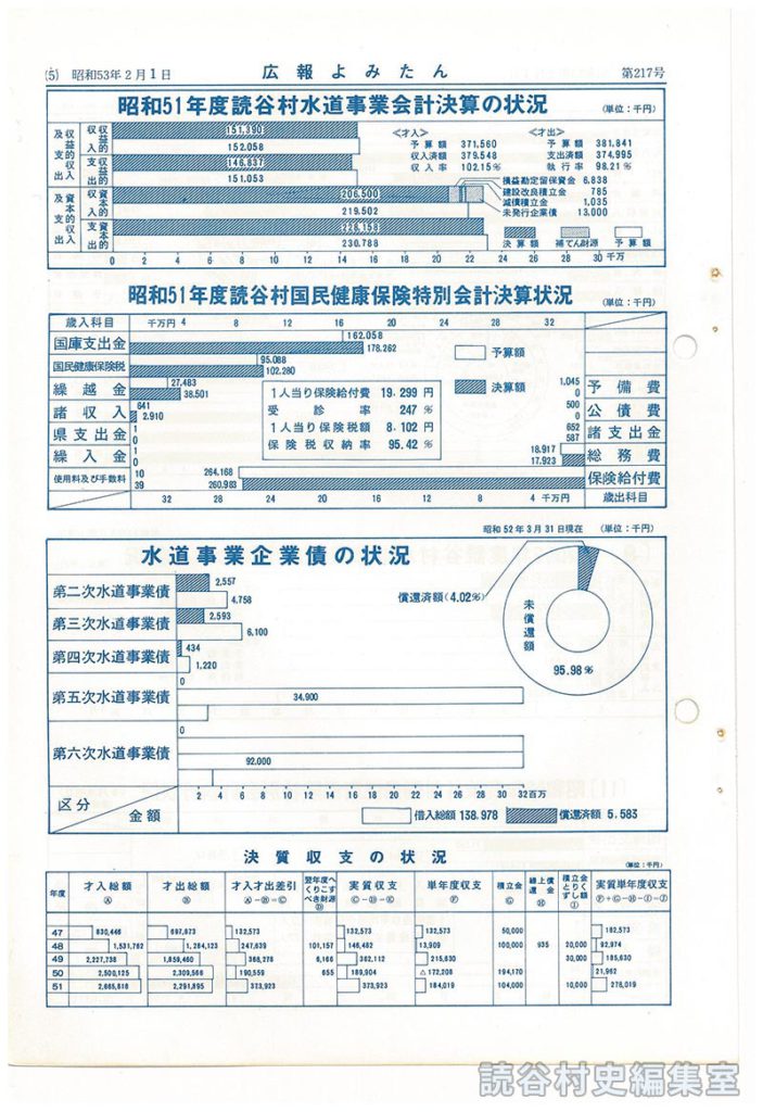 1978年2月発行 広報よみたん / 5頁 読谷村の財政 昭和51年度決算 昭和52年度上半期 昭和51年度読谷村水道事業会計決算の状況 昭和51年度読谷村国民健康保険録別会計決算状況 水道事業企業債の状況 決算収支の状況 この号の全件を見る 〔217号2~4ページの続き〕 ※表「昭和51年度読谷村水道事業会計決算の状況」、「昭和51年度読谷村国民健康保険録別会計決算状況」、「水道事業企業債の状況」、「決算収支の状況」へ原本参照