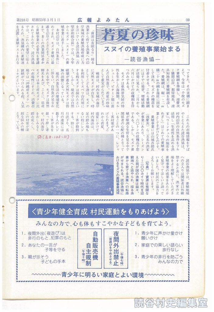 養殖事業には山城吾助氏(渡慶次)ら二五名の漁家が事業にあたり、シーズン中、六〇トンの収穫高予想である。しかし、モズク養殖が順調な生育を見る中で関係者の心配の種となっていることの一つに、レジャー客対策かあげられます。これから若夏、盛夏にかけて村内海浜は、足の踏み場もない程にレジャー客が殺到する。特に三月浜下り、五月の連休には数千人のレジャー客が先を競って押し寄せ、村内海岸をおしみなく踏み荒らし、この対策が深刻な悩みの種となっている。