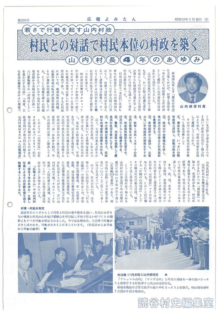 山内村長は歴代村長の中で最も若く、かつ行動力旺盛な青年村長として村民から大きな期待が寄せられ無投票当選をなしえた。時に当時三九歳という青年村長の誕生であった。