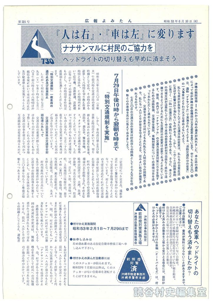 このように来たる七月三〇日に実施される交通方法の変更はまさに秒読みの段階に入っており、国、県、村においても「ナナサンマル」に向けて段大の努力を払い取り組んでいます。道路交通の革命ともいえる今回の交通区分変更は、関係者のみで達成されるものではありません。県民一人ひとりが自らの問題としてとらえ、運転者も歩行者もすべて初心にかえり県民一人ひとりが交通ルールをよく守り、よく理解してこそ円かつな実施が計れるものです。村民一人一人のご協力のもとに「ナナサンマル」を成功させよう。尚、村ではあらゆる集会の機会を利用して村民への周知徹底を図っていく計画であり村民のご協力を呼びかけています。