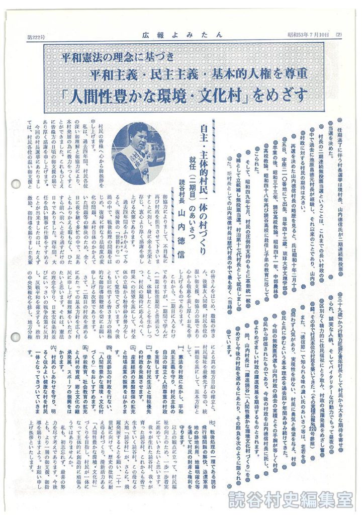 そして、昭和四九年七月、村民の圧倒的支持のもとに革新統一候補として立候補し無投票当選。村治第十七代村長として就任しました。新村長としての山内徳信村長は歴代村長の中で最も若く(当時三十九歳)かつ行動力旺盛な青年村長として村民から大きな期待を寄せられ、誠実な人柄、そしてバイタリティーな行動力でもって昼夜の区別なく精力的に住民福祉にとり組み、村政の飛躍発展を目指し奮闘。その中で村民本意の村政を築いてきた。(その実績広報No.220号参照)