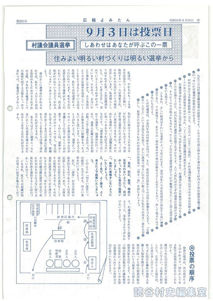 この村議選は、今後四年間の村政を方向づけ、また、政治は直接私たちの台所に影響を与えます。「自分一人なら」という安易な心を捨て、正しい選挙で明るい住みよい郷土づくりに私たちの清き一票を大切にし、投票日には必らずそれぞれの所定の投票所で「清き一票」を投じましょう。