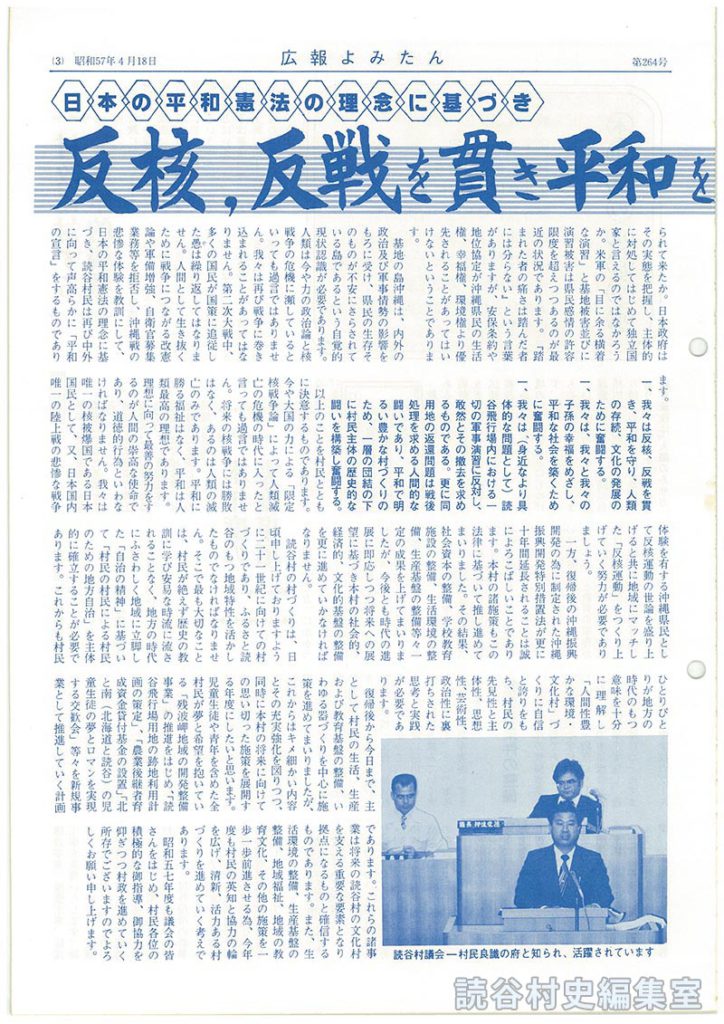 以上のことを村民とともに決意するものであります。今や大国の力による「限定核戦争論」によって人類滅亡の危機の時代に入ったと言っても過言ではありません。将来の核戦争には勝敗はなく、あるのは人類の滅亡のみであります。平和に勝る福祉はなく、平和は人類最高の理想であります。理想に向って最善の努力をするのが人間の崇高な使命であり、道徳的行為といわなければなりません。我々は唯一の核被爆国である日本国民として、又、日本国内唯一の陸上戦の悲惨な戦争体験を有する沖縄県民として反核運動の世論を盛り上げると共に地域にマッチした「反核運動」をつくり上げていく努力が必要でありましょう。