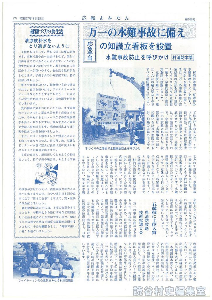 村内の海浜は快適な海水浴場として広く知られ、村内外から連日多くの海水浴客が押し寄せ、にぎやかさ一番をみせています。楽しいはずの海水浴、だが水難事故を起こしては何んにもなりません。水魔はちょっとした心の油断で魔手はさし出されます。水の中でのふざけあい、海水浴のきまりを守らない、等々が水魔を呼ぶきっかけになります。