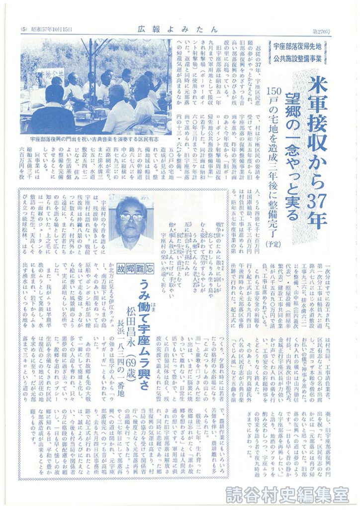 戦後三七年、生れ育った故郷は忘れがたく「誰か故郷を想わざる」とは人間共通の想いです。軍用地に供された旧宇座部落は解放され、同時に悲願であった郷里復興の気運は高まり、村当局の協力を受けて関係省庁へ幾度となく元部落再興の請願を行ってきた。ようやく三七年目にして部落再興への道は開かれ、元宇座部落復元へのつち音が高鳴り、去る九月四日区事務所跡で起工式が行われたことは、誠によろこびにたえない、今後も村当局や関係者の方に格段の御配慮をお願いし、一日も早く懐しの故郷に帰れる日、平和で豊かな部落造成が出来ることを願うものです。