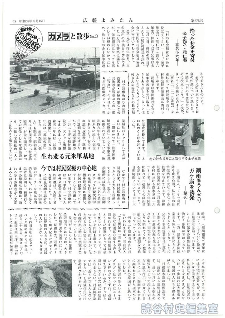 十四日未明に起きたユーバンタ岬のガケくずれは、長さ三十五メートル、深さ三~七メートル・面積は四五坪、約二百トンにおよぶ岩石が海面下にずれ落ちています。近くには住宅が居並らび、数メートル手前までえぐり取られた岩はだは、自然災害の恐ろしさをまざまざと見せつけ、一歩過れば大惨事にと、地域の人たちを震えあがらせました。