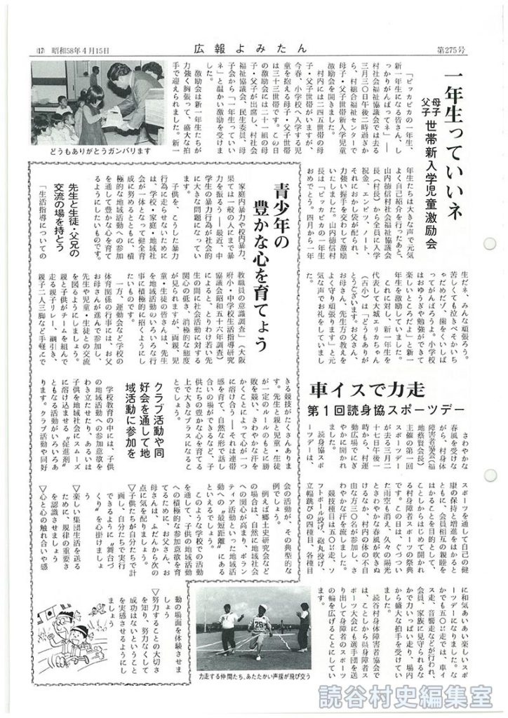 「ピッカピカの一年生、新一年生になる皆さん、しっかりがんばってネ」-村社会福祉協議会では去る三月三〇日午後二時過ぎから、村総合福祉センターで母子・父子世帯新入学児童激励会を開きました。