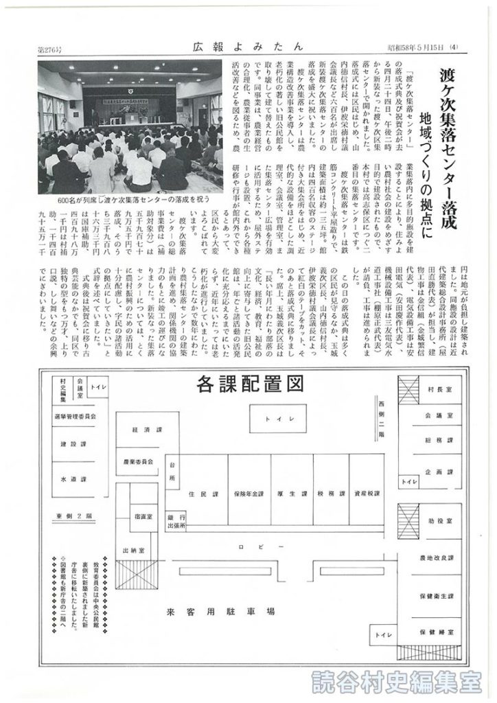 渡ケ次集落センターは鉄筋コンクリート平屋造りで、建築面積は約一三五坪。館内は四百名収容のステージ付き大葉会所をはじめ、近代的な設備をほどこした調理室、会議室、管理室、また集落センター広場を有効に活用するため、屋外ステージも設置、これから各種研修や行事が館内外でできるとあって、区民から大変よろこばれています。