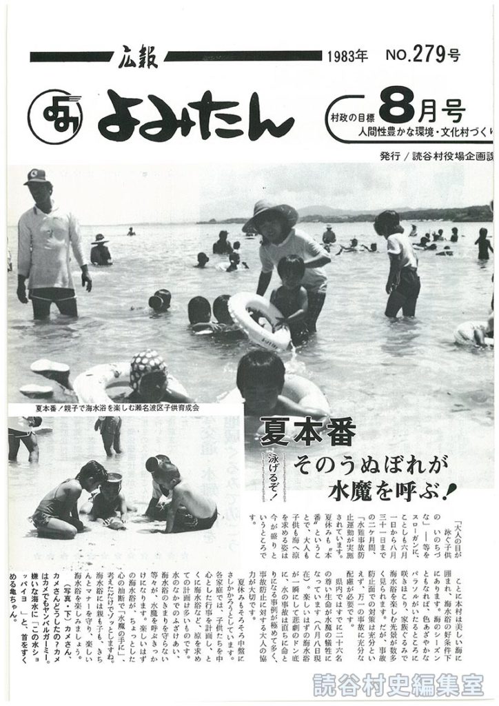 ことに本村は美しい海に囲まれ、海水浴の好条件下にあります。海のシーズンともなれば、色あざやかなパラソルがいたるところに咲きほこり、家族ぐるみで海水浴を楽しむ光景が数多く見られます。だが、事故防止面での対策は充分といえず、万一の事故に充分な配慮が必要です。