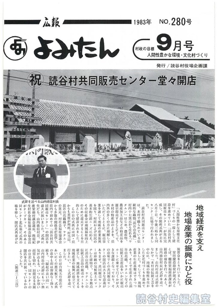 安田慶造助役が開式のことば、棚原栄福経済課長が経過の報告を行ったあと、山内徳信村長が式辞を述べました。山内村長は式辞のなかで「本村は伝統工芸を中心に、地域の特性を生かした文化村づくりを進めてきました。そして今、地域産業の生産基盤はできつつあり、そこで生産された読谷山花織、ヤチムンなどの伝統工芸産品をいかに販売ルートに乗せて行くかが大きな課題となっており、その意味でこの共同販売センターの開店は大きな意義があります。共同販売センターは沖縄の気候風土にマッチした建物で、ここを拠点に読谷山花織、ヤチムンの伝統工芸品の販売ルートを確立し、地域経済を支える地域産業の振興に役立てて行きたい。」と式辞を述べました。
