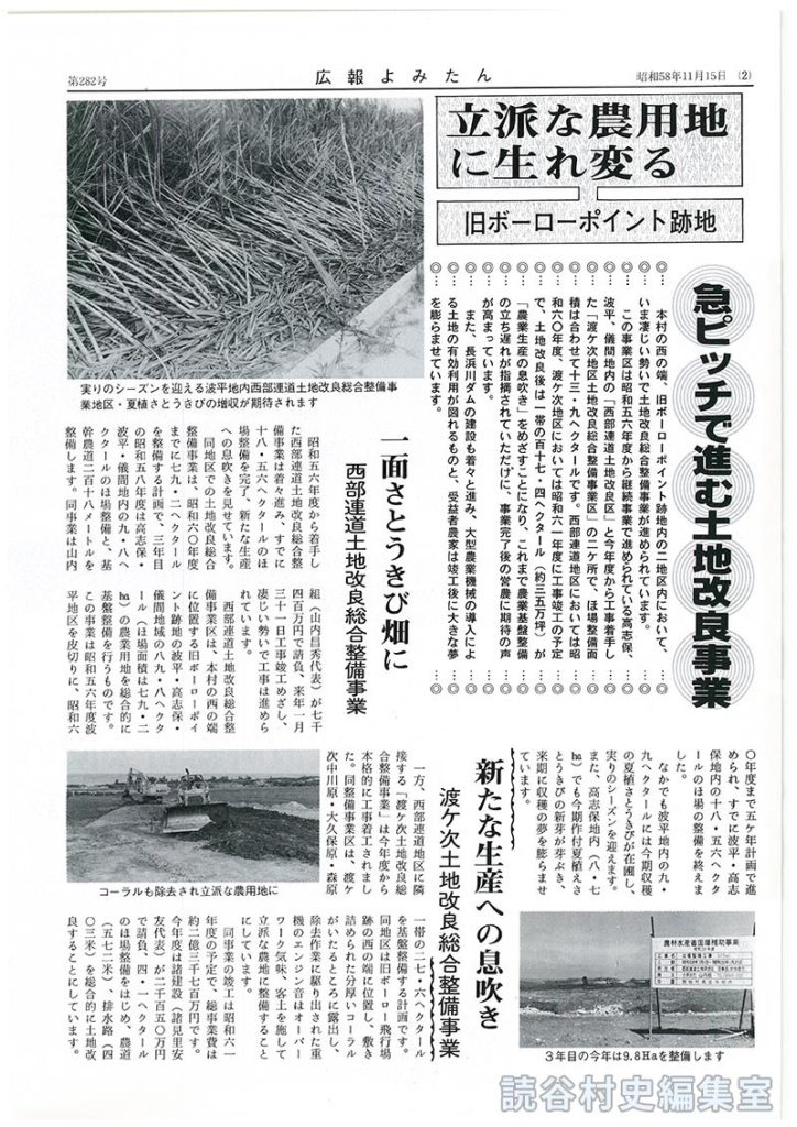 同地区での土地改良総合整備事業は、昭和六〇年度までに七九・二ヘクタールを整備する計画で、三年目の昭和五八年度は高志保・波平・儀間地内の九・八ヘクタールのほ場整備と、基幹農道二百十八メートルを整備します。同事業は山内組(山内昌秀代表)が七千四百万円で請負、来年一月三十一日工事竣工めざし、凄じい勢いで工事は進められています。