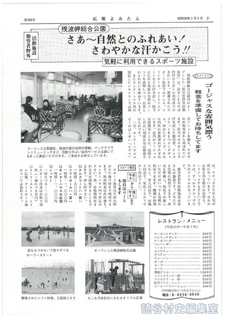 ※写真「ゴージャスな雰囲気、残波の里の自然の景観、バックグラウンドミュージックなど気配りのよい店内サービスは誰にでもきっと満足いただけます。ご来店をお待ちしています。」、「オープンした残波岬総合公園」、「尻もちつかないで恐々すべるローラースケート」、「大人も子供気分になれますトリム広場」、「整備されたソフト球場2面使えます」は原本参照