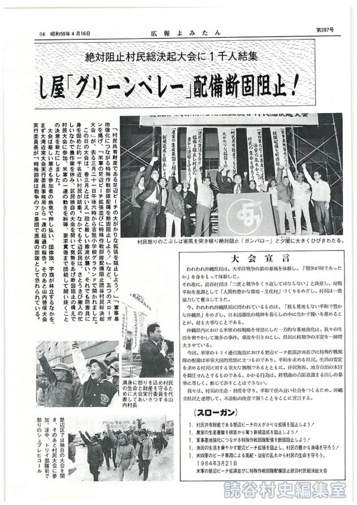 我々は、村民の生命・財産を守り、平和で住み良い社会をつくるため、沖縄全県民と連帯して、不退転の決意で闘うことをここに宣言する。