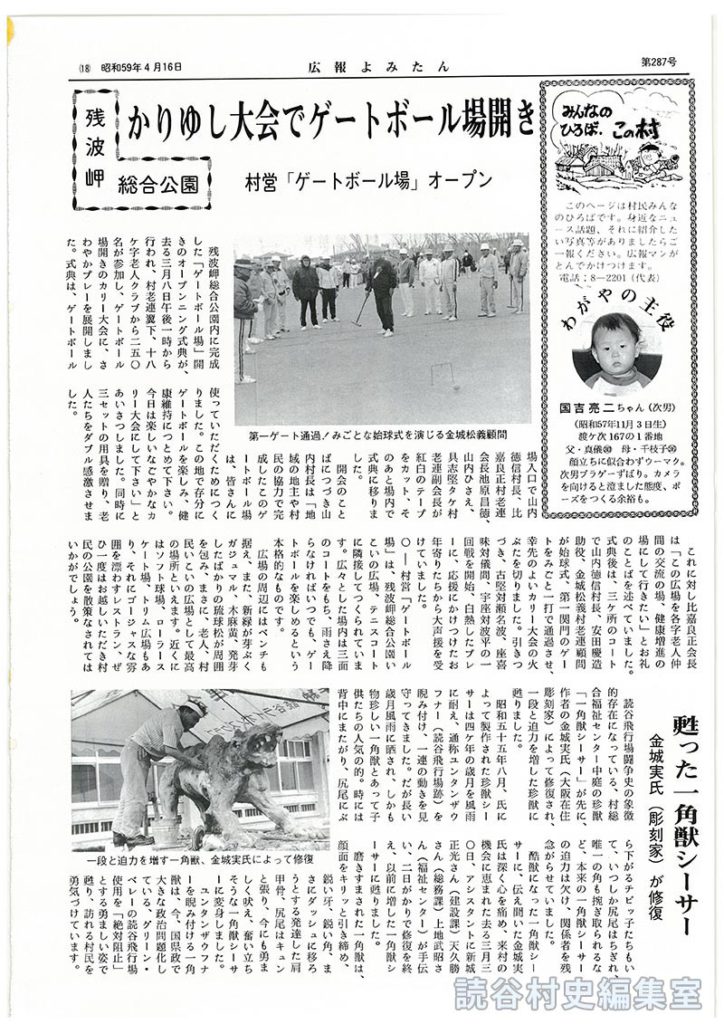 酷獣になった一角獣シーサーに、伝え聞いた金城実氏は深く心を痛め、来村の機会に恵まれた去る三月三〇日、アシスタントに新城正光さん(建設課)天久勝さん(総務課)上地武昭さん(福祉センター)が手伝い、二日がかりで修復を終え、以前に増した一角獣シーサーに甦りました。