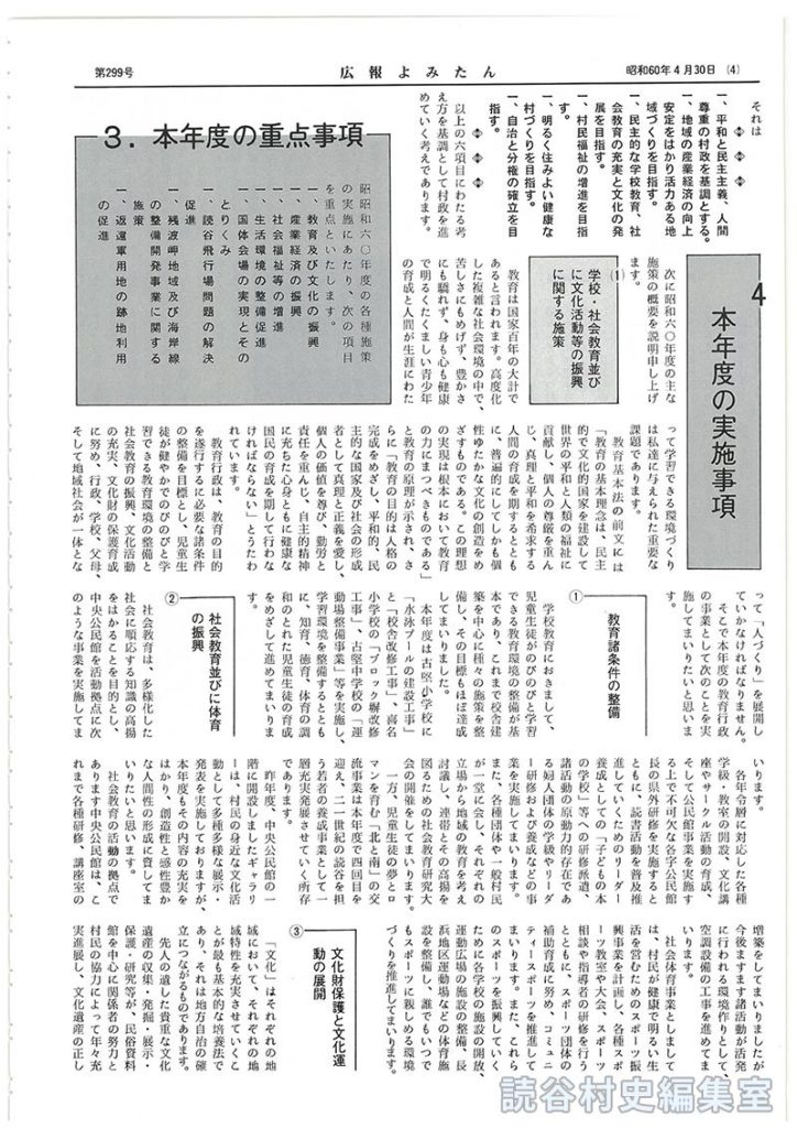 五度び声高らかに「平和宣言」平和で明るい豊かな文化村づくりを目指す 昭和60年度施政方針 2村政に対する基本姿勢 3本年度の重点事項 4本年度の実施事項 (1)学校・社会教育並びに文化活動等の振興に関する施策