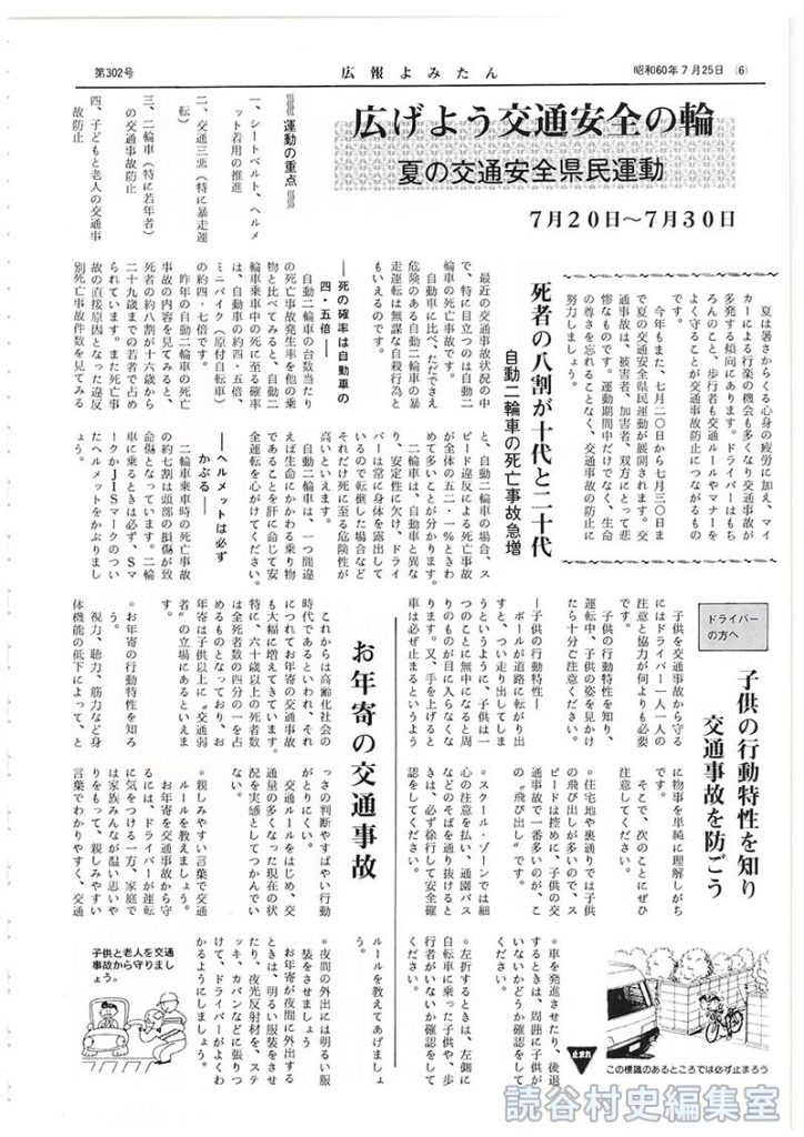 今年もまた、七月二〇日から七月三〇日まで夏の交通安全県民運動が展開されます。交通事故は、被害者、加害者、双方にとって悲惨なものです。運動期間中だけでなく、生命の尊さを忘れることなく、交通事故の防止に努力しましょう。