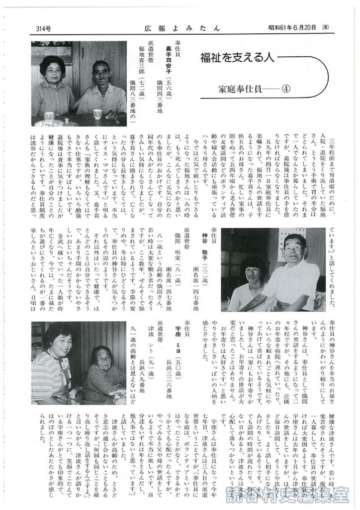 五九年の四月一日家庭奉仕員に委嘱されて、福地さんの世話をするようになった嘉手苅さんは、子供五名のお母さん。忙しい家事の間をぬって五四年頃から老人世帯の友愛訪問などのボランティア活動や婦人会活動にも頑張っているハリキリ母さんです。
